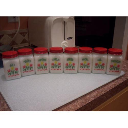 <table width="100%" border="0" cellspacing="0" cellpadding="4"><tr><td><em> </em></td></tr><tr> <td width="100%"> This is a set of eight spice jars done in the tulip design of the old Tipp City jars. The jars are old milkglass jars with the fluted side and the tops are original. The tops have been repainted and the decals are new. The decals are copies of the old design and a very close match. You have holes in the top of the salt and pepper and they are good. There are two metal inserts in the paprika and garlic. The other four do not have the metal inserts. In this set you have a salt, pepper, paprika, basil, dill, garlic, tarragon & sage. There are no chips or cracks. This is a cheery set sure to brighten any kitchen.