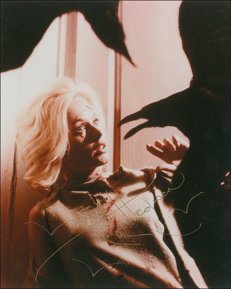 Two color glossy 8 x 10 photos of Hedren being attacked by feathered fiends—the two images reverse negatives of each other—each signed in gold ink “Tippi Hedren” adding a few small bird drawings around her name. In overall fine condition.