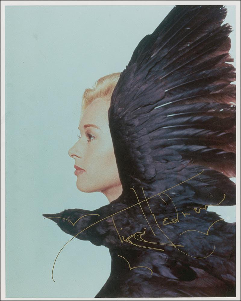 Color glossy 8 x 10 close-up photo of Hedren and a feathered friend, signed in-person in gold ink. In fine condition.