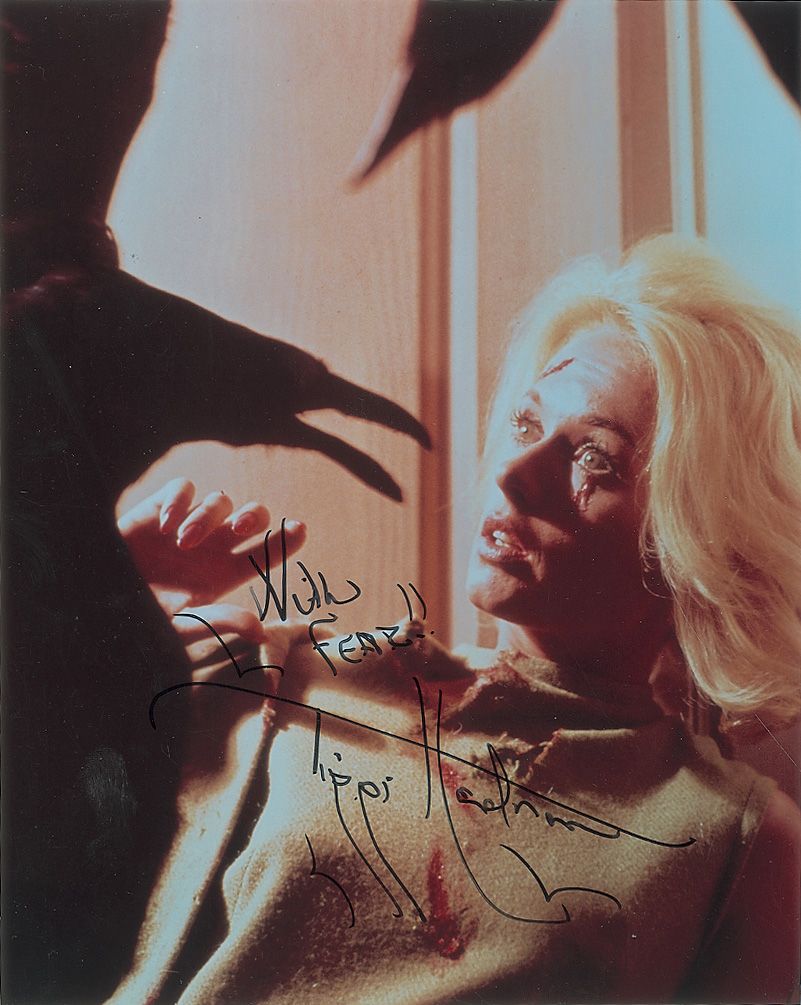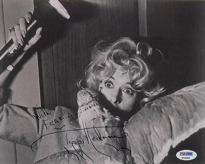 Two glossy photos from Hitchcock’s The Birds, 8 x 10 and 10 x 8, one color, each signed in black felt tip, “With fear!! Tippi Hedren.” In fine condition, with a PSA/DNA label affixed to the lower right corner of one. One accompanied by a certificate of authenticity from PSA/DNA.