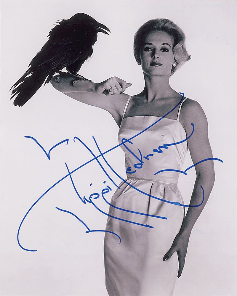 Glossy 8 x 10 photo of Hedren with a feathered friend on her arm, signed in blue felt tip, adding a couple of quick bird sketches. In very fine condition.