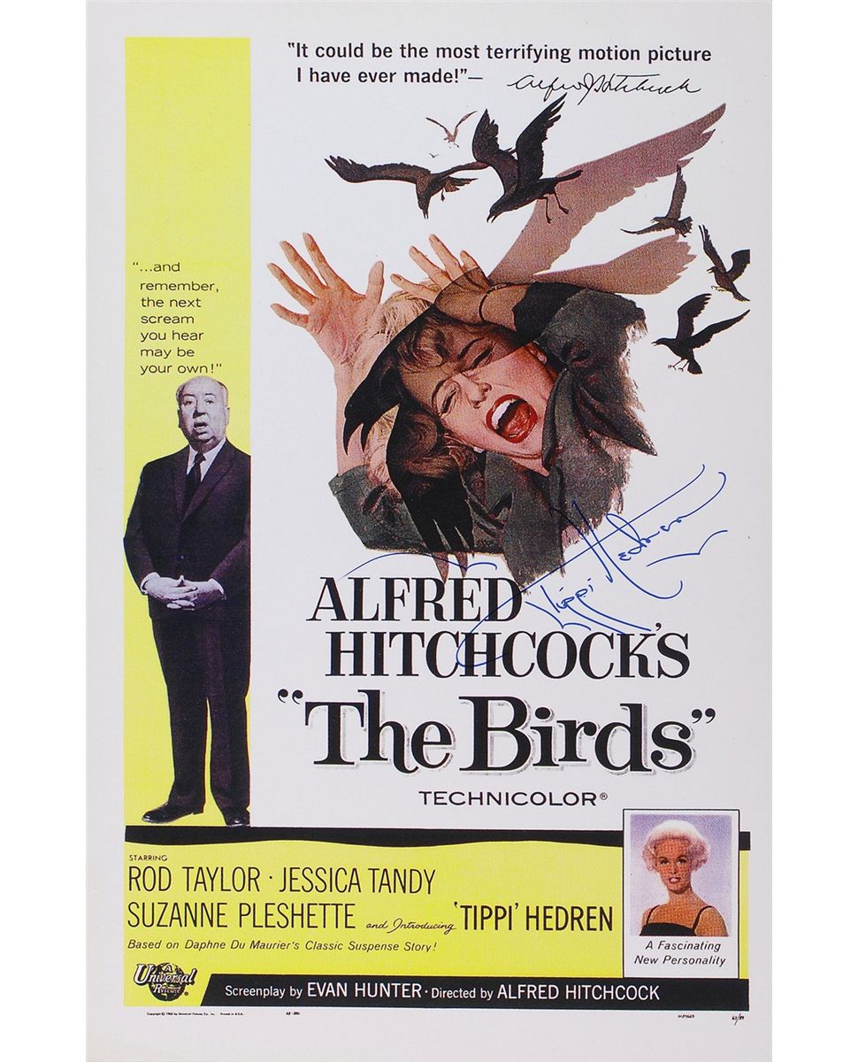 Color 11 x 17 mini-poster for The Birds, signed in person in blue felt tip. In fine condition. Originally obtained by in-person specialist Mike Wehrmann.