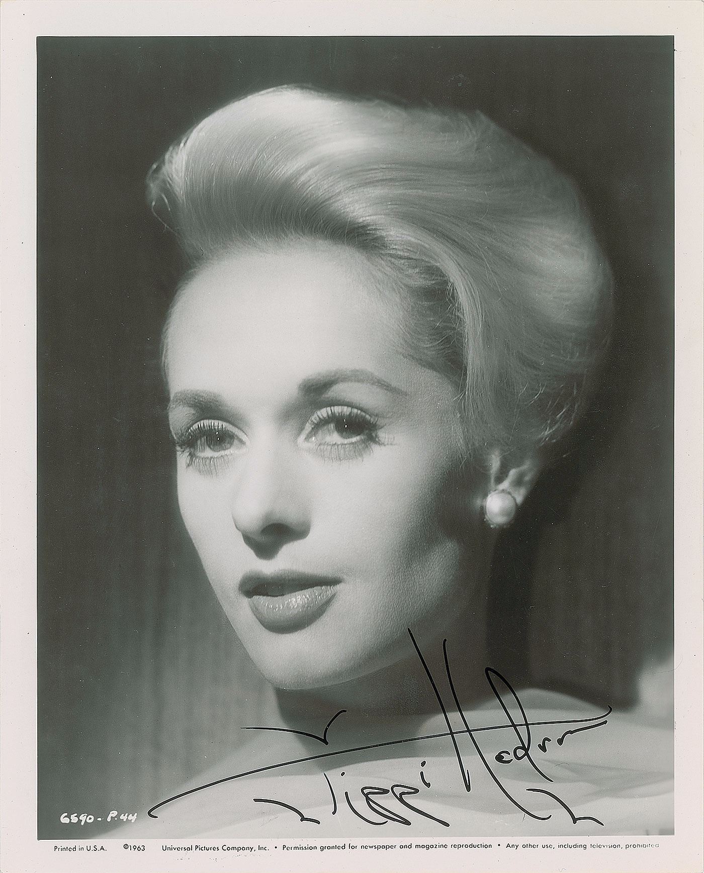 Glossy 8 x 10 publicity headshot of Hedren for Alfred Hitchcock's 1963 classic The Birds, signed in black felt tip. Reverse bears an affixed caption. In fine condition. From the Harvey and Rhoda Kuflik Collection.