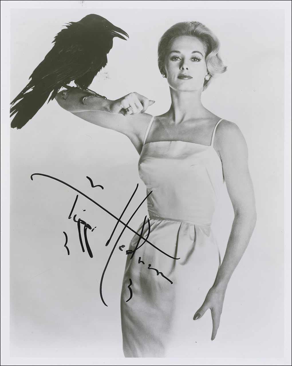 Glossy 8 x 10 photo of Hedren and a feathered friend, signed in black felt tip by Hedren, adding a few quick bird sketches around her signature. In fine condition, with some scattered light bends and creases, none affecting signature.