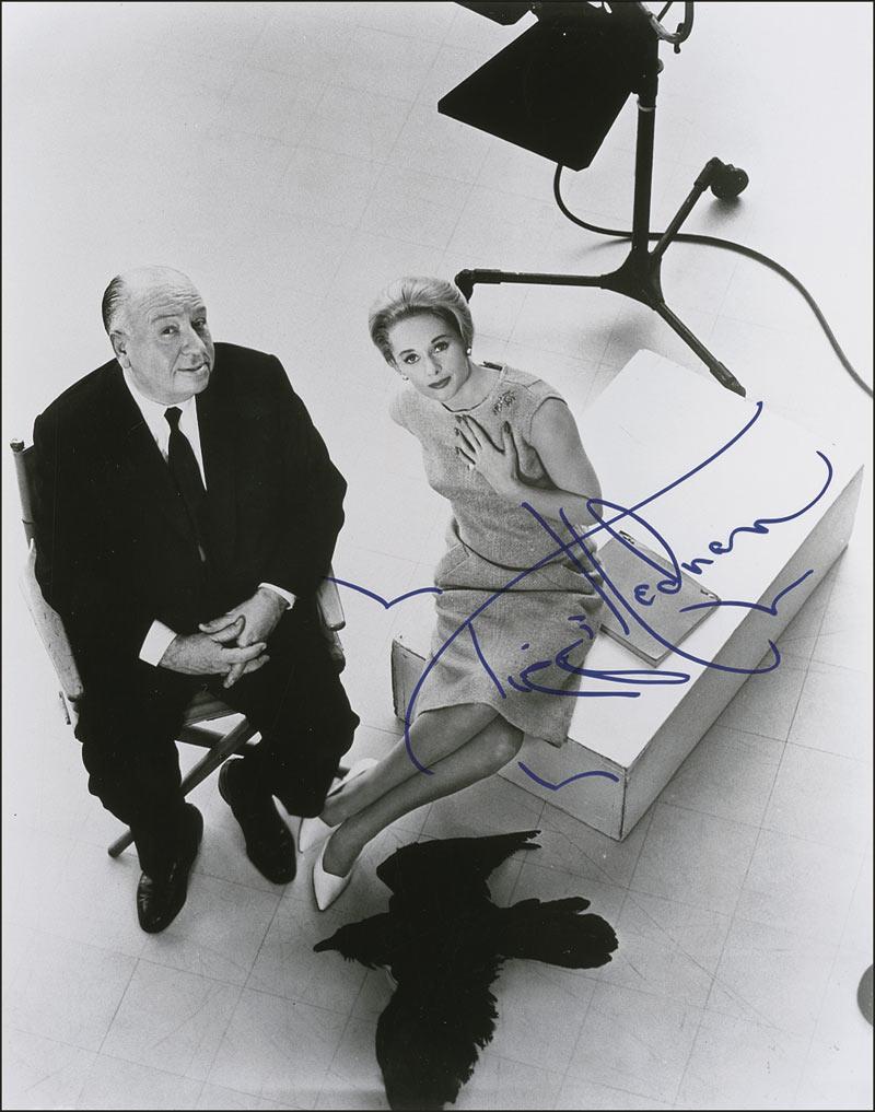 Glossy 8 x 10 photo of Hedren posing with Alfred Hitchcock, signed in blue felt tip by Hedren, adding a couple small bird sketches around her signature. In very fine condition. Pre-certified PSA/DNA and RRAuction COA.