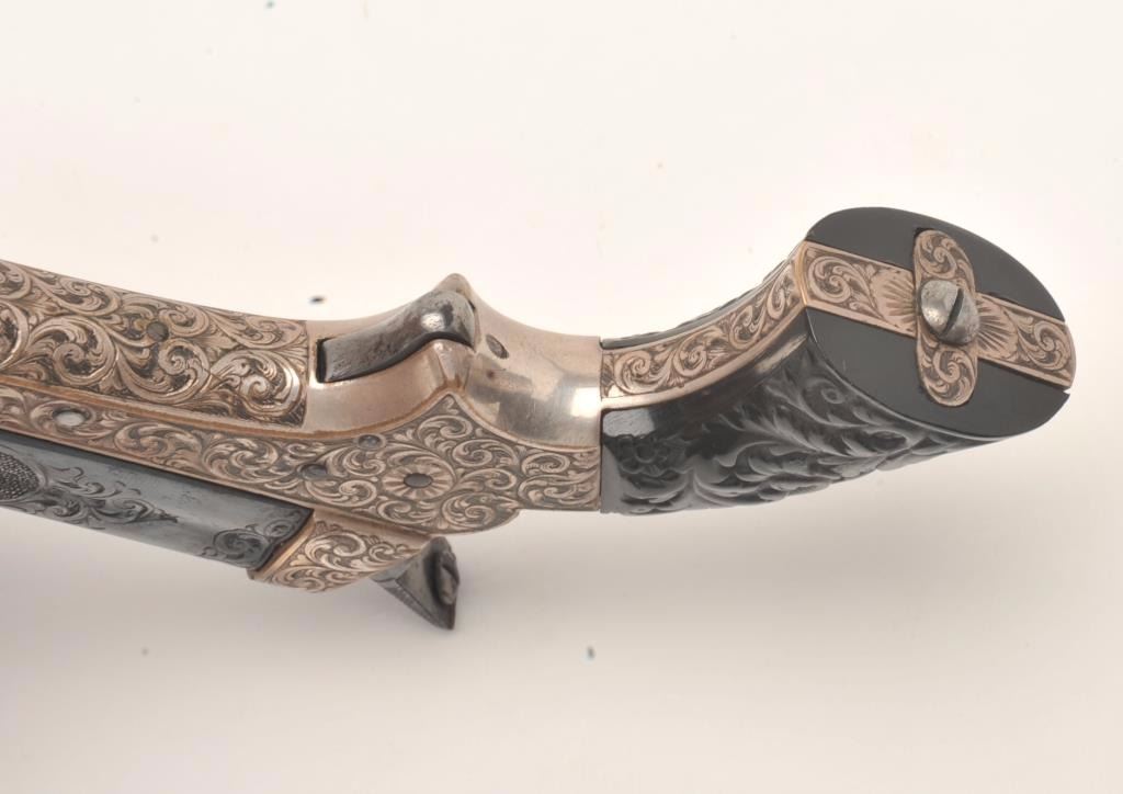 Tipping & Lawden Sharps four barrel derringer, finely and extensively scroll engraved, blued finish, deluxe floral relief hard rubber grips, no visible S/N, with fancy wooden presentation case. The gun is inoverall fine condition displaying the majority of its original blued finish on the barrel assembly, the brass frame retains some silver wash in protected areas, crisp action, sharp markings and fine grips. Thewood presentation case is also in overall fine condition. (Antique). Est.: $2,500-$5,000.