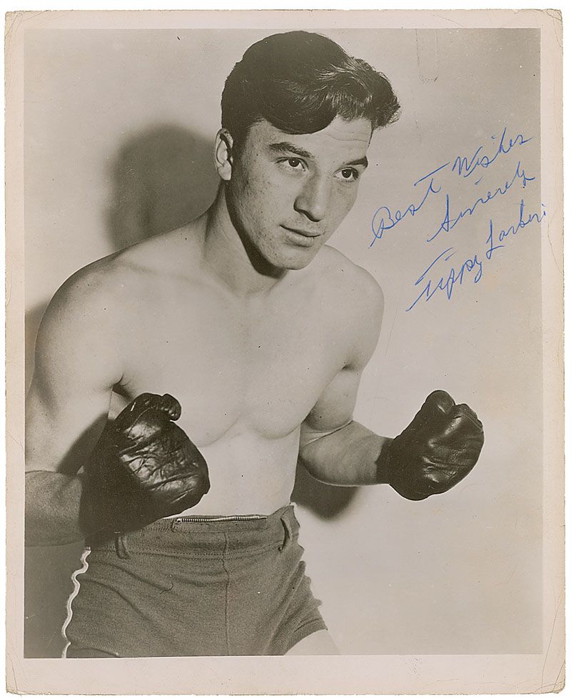 Boxer who appeared on the cover of The Ring magazine in July 1944 and was at one time the world’s junior welterweight champion (1917–1991). Glossy 8 x 10 photo of Larkin in his prime, signed in blue ballpoint, “Best wishes, Sincerely, Tippy Larkin.” In very good to fine condition, with scattered creases and a paperclip impression to top edge.