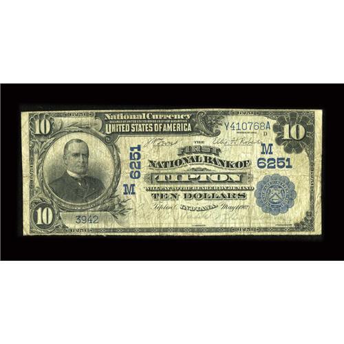 <B>Tipton, IN</B></I> - $10 1902 Date Back Fr. 616 <B>The First NB</B></I> Ch. # (M)6251<BR>Large notes only from this Tipton bank. <B>Very Good-Fine.</B></I><BR><BR><b>Shipping:</b> Coin/Currency (<a target="_blank" href="http://www.heritageauctions.com/common/shipping.php">view shipping information</a>)