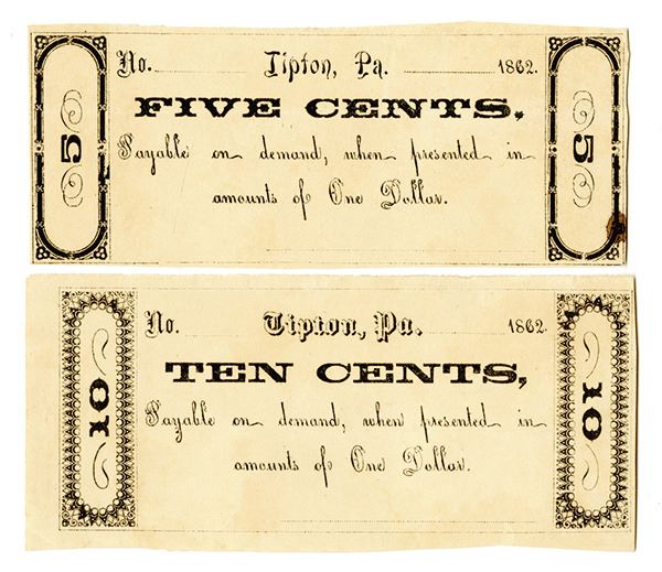 Tipton, PA. Lot of 2 notes, Includes 5 cents and 10 cents denominations, Uncirculated, stain on lower right border of 5 cents. Very scarce.