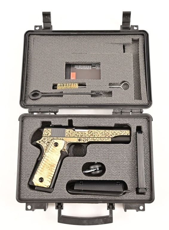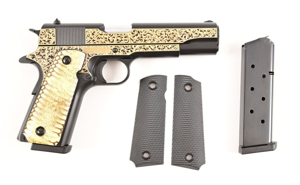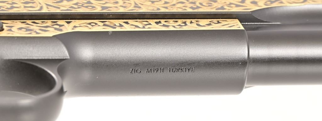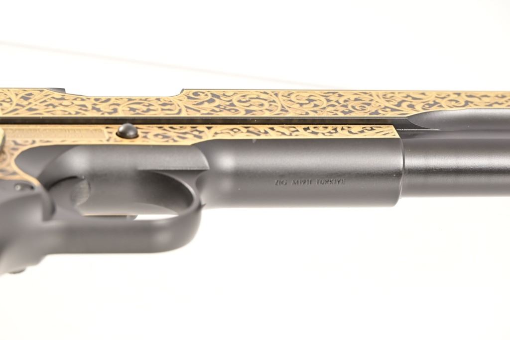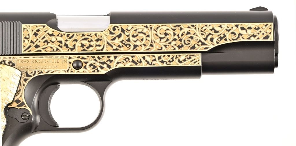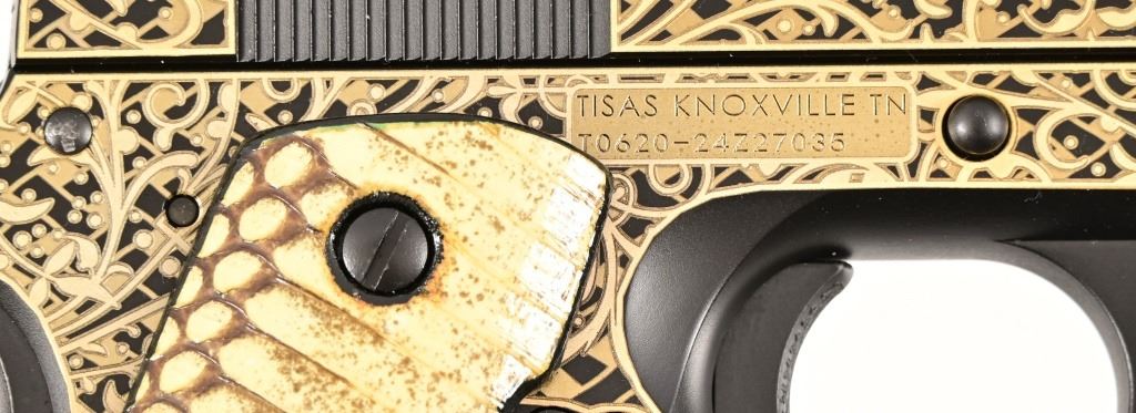 S/N T0620-24Z27035. Manufactured by Tisas, Knoxville Tennessee. Scroll engraving on slide and frame. Like new in original box. Modern