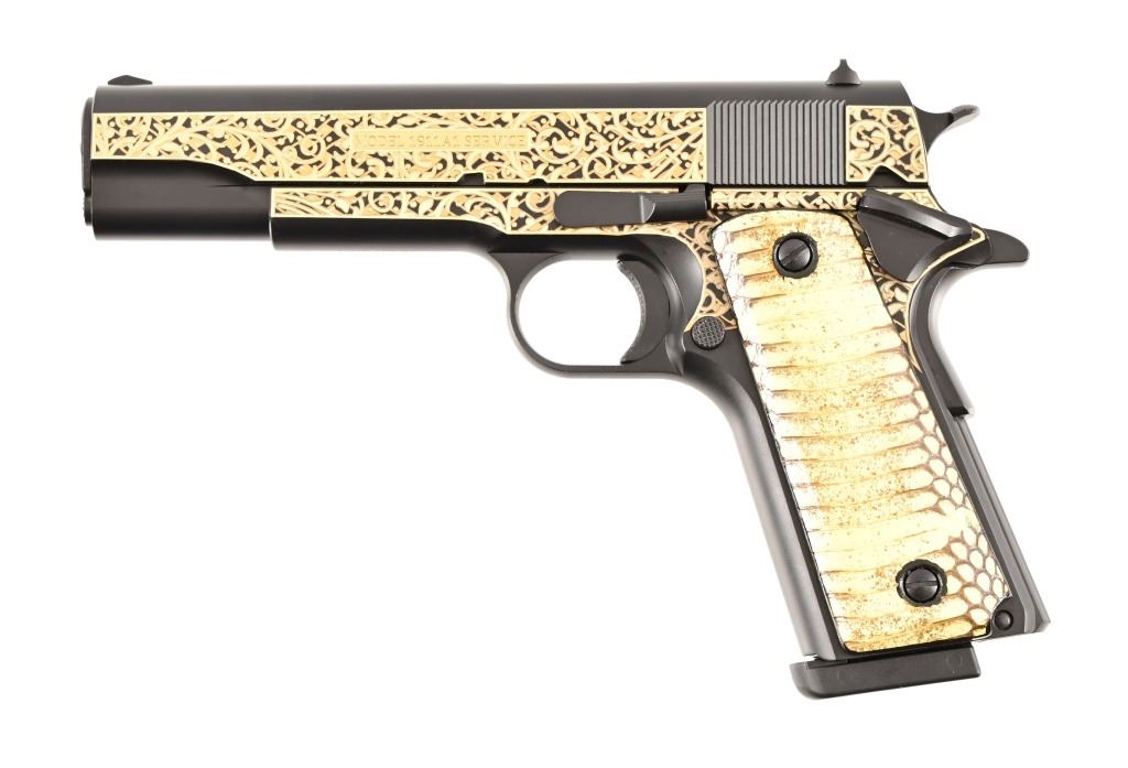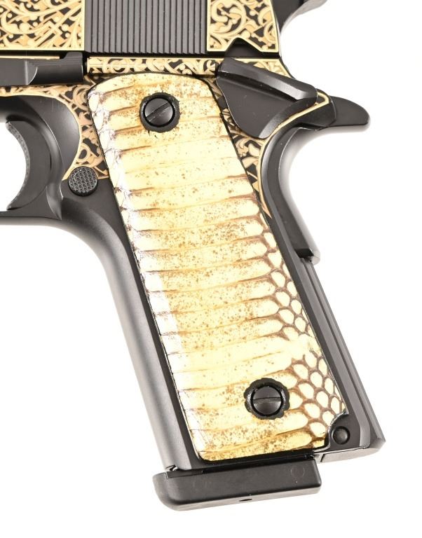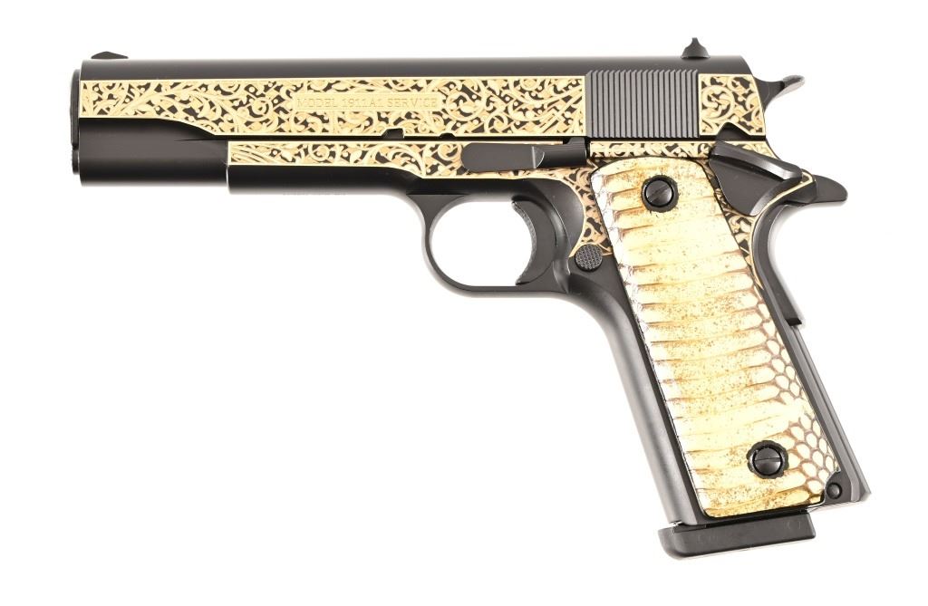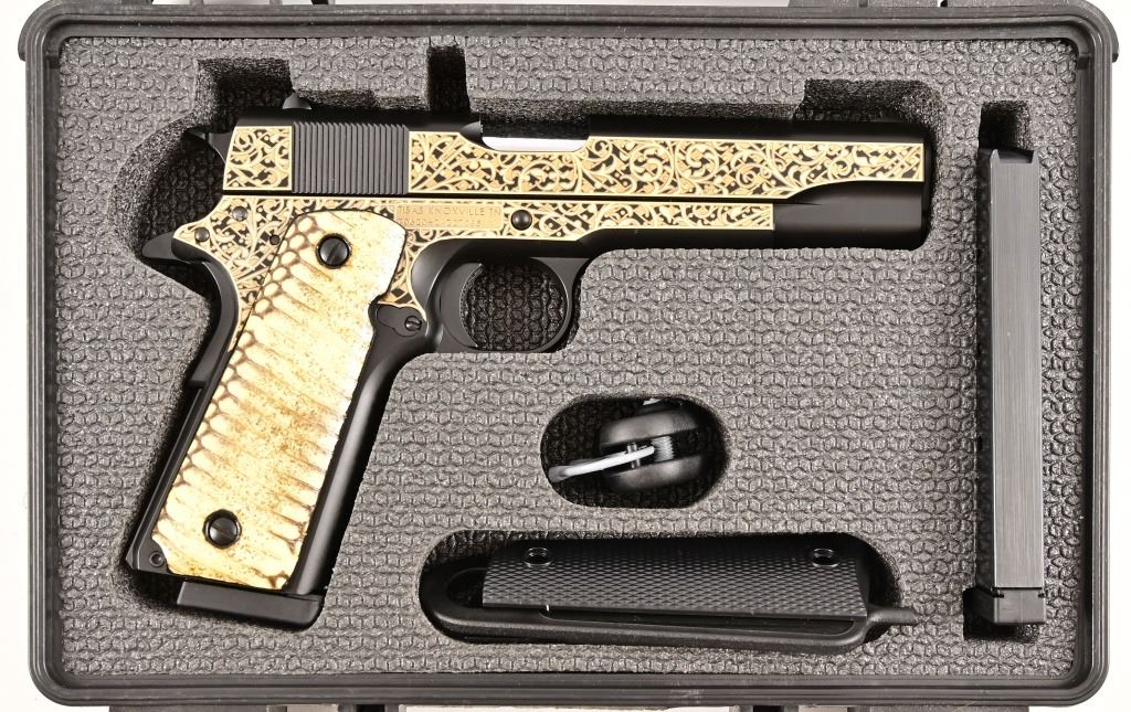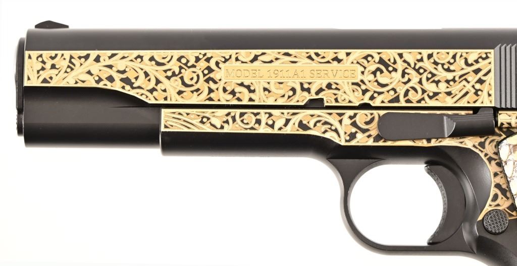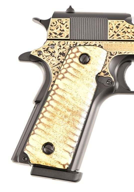 S/N T0620-24Z27035. Manufactured by Tisas, Knoxville Tennessee. Scroll engraving on slide and frame. Like new in original box. Modern