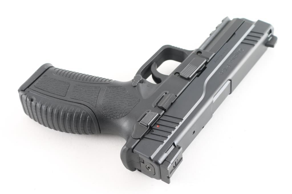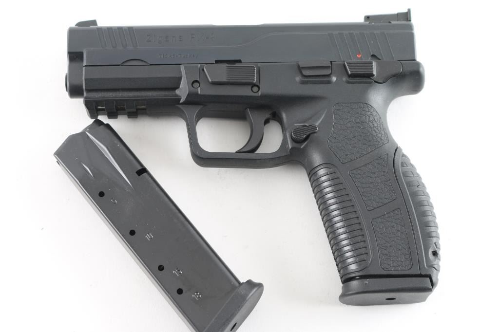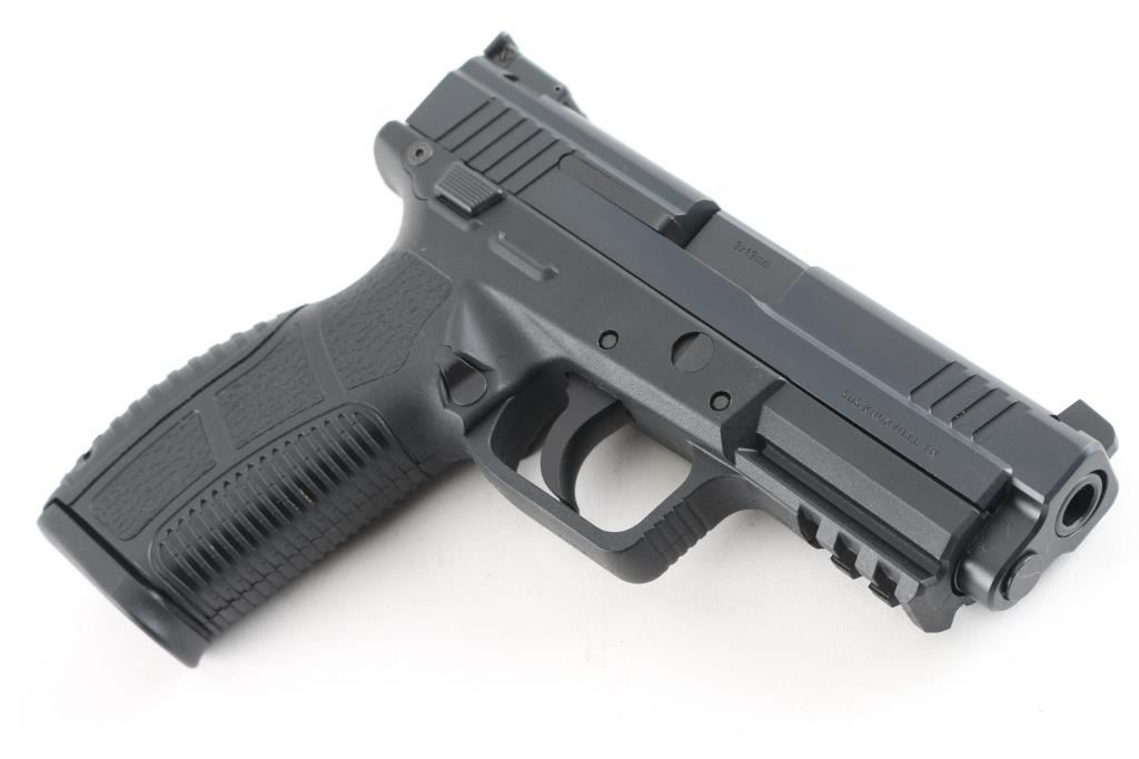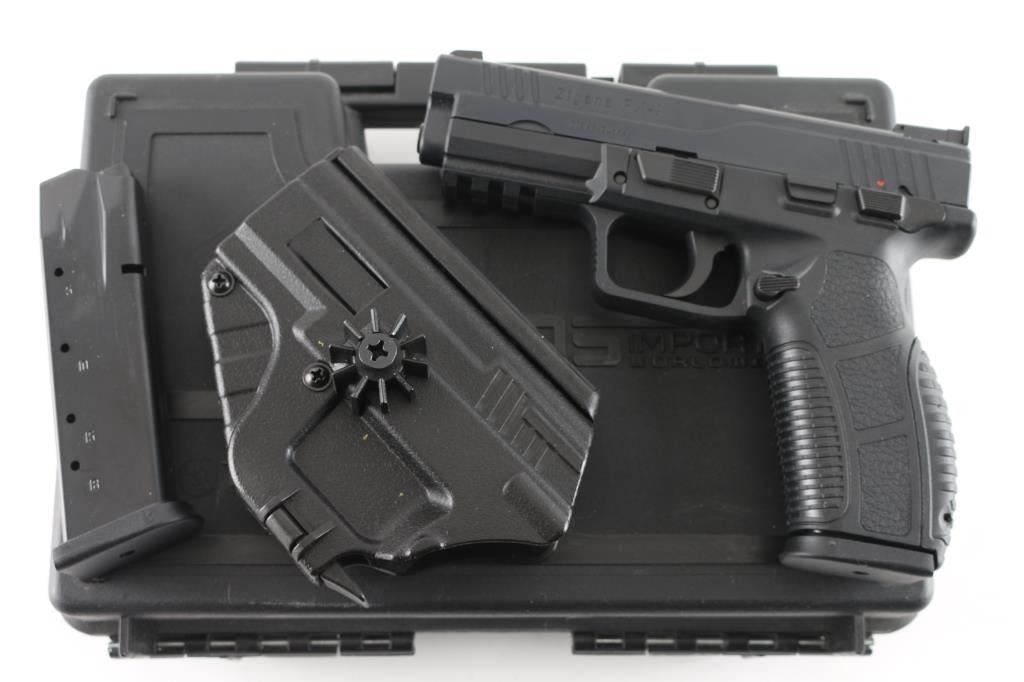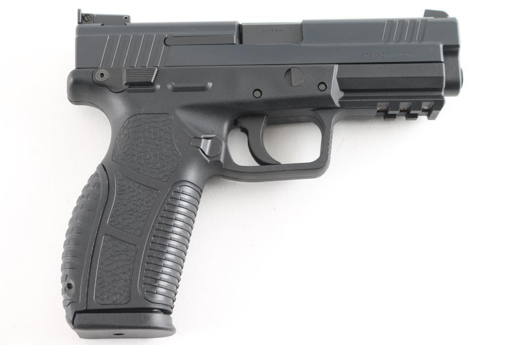 SN: T0620-20BM13692. Semiautomatic pistol manufactured in Turkey, and imported by SDS Knoxville, TN. Matte black slide with blade/notch sights. 4" barrel, black polymer frame with integrated M1913 rail, and adjustable backstrap inserts. 15+1 Capacity. Pistol is in almost new condition, bore is excellent. Comes in factory hard case with 15 rd magazine with loader, (2) total, cleaning gear, manual, and holster. NRA Condition-Excellent+ Modern Firearm.