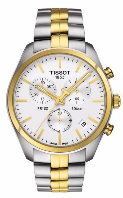 Model: T101.417.22.031.00 - CASE = [Material:Stainless Steel], [Case Diameter:41], [Case Thickness:10.71mm], [Bezel:Fixed], [Case Back:Solid], [Water Resistant:100 Meters - 330 Feet], [Crystal:Scratch Resistant Sapphire],; DIAL = [Color:Silver],; MOVEMENT = [Type:Quartz Chronograph], [Crown:Push In],; BAND = [Clasp:Deployment], [Type:Stainless Steel and PVD Gold], (Usually ships in 1 to 2 weeks.)