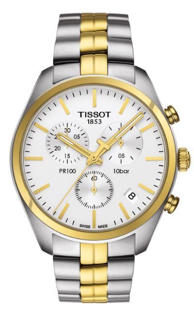 Model: T101.417.22.031.00 - CASE = [Material:Stainless Steel], [Case Diameter:41], [Case Thickness:10.71mm], [Bezel:Fixed], [Case Back:Solid], [Water Resistant:100 Meters - 330 Feet], [Crystal:Scratch Resistant Sapphire], DIAL = [Color:Silver], MOVEMENT = [Type:Quartz Chronograph], [Crown:Push In], BAND = [Clasp:Deployment], [Type:Stainless Steel and PVD Gold], (Usually ships in 1 to 2 weeks.)