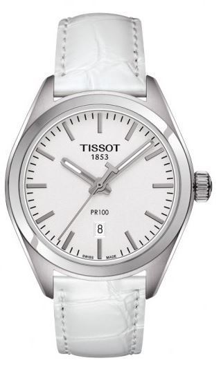Model: T101.210.16.031.00 - CASE = [Material:Stainless Steel], [Case Diameter:33], [Case Thickness:9mm], [Bezel:Fixed], [Case Back:Solid], [Water Resistant:100 Meters - 300 Feet], [Crystal:Scratch Resistant Sapphire], DIAL = [Color:White], MOVEMENT = [Type:Quartz], [Crown:Push In], BAND = [Clasp:Tang], [Type:White Leather], (Usually ships in 1 to 2 weeks.)