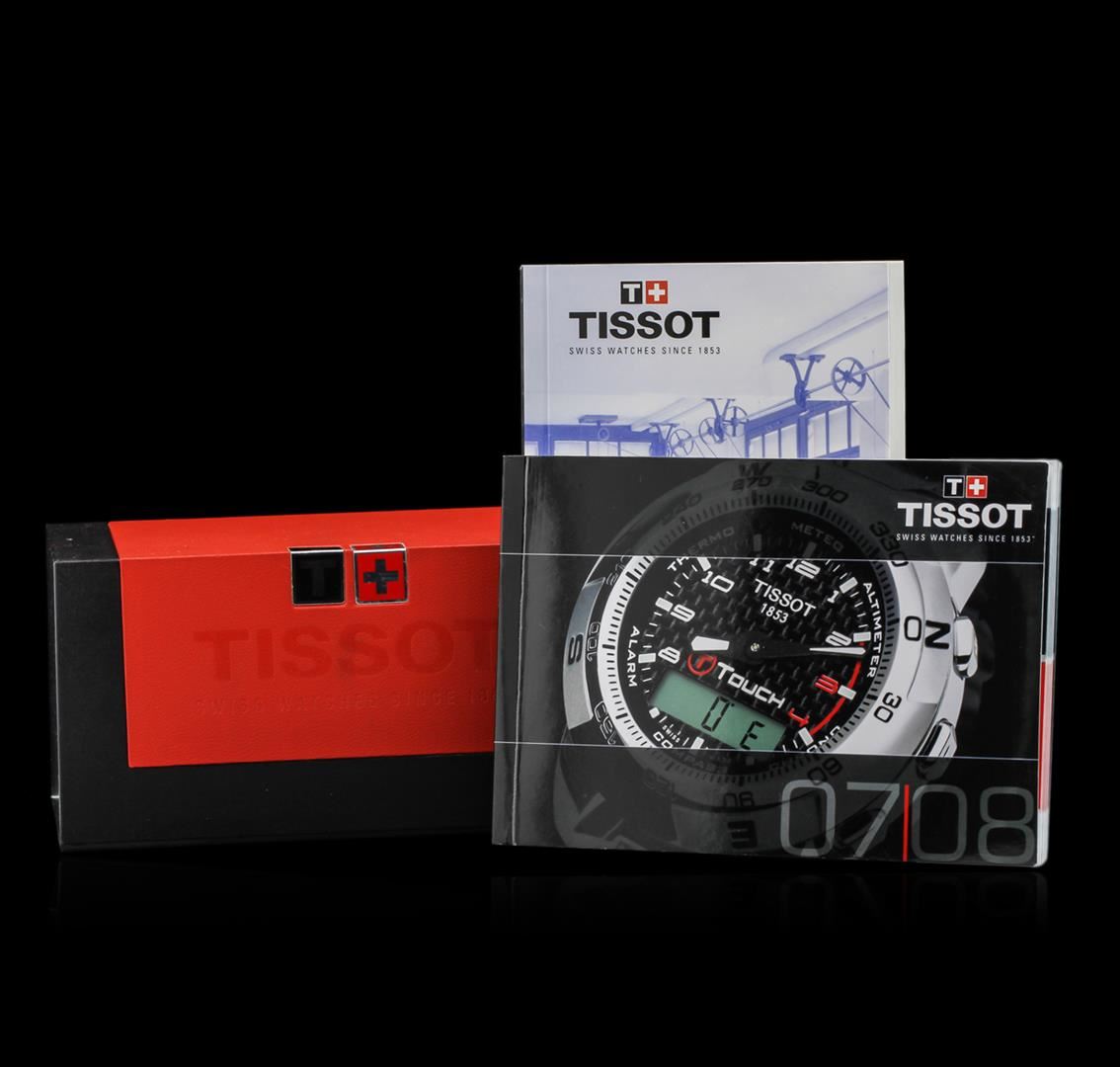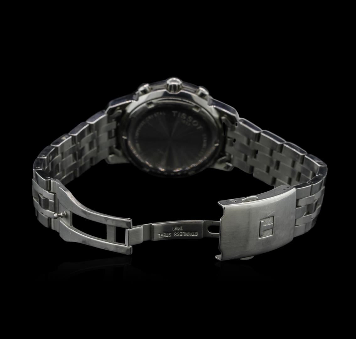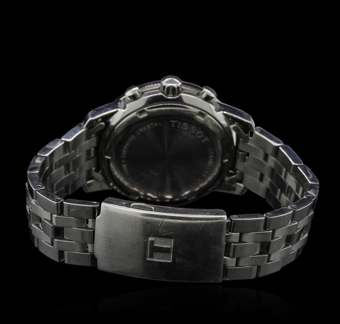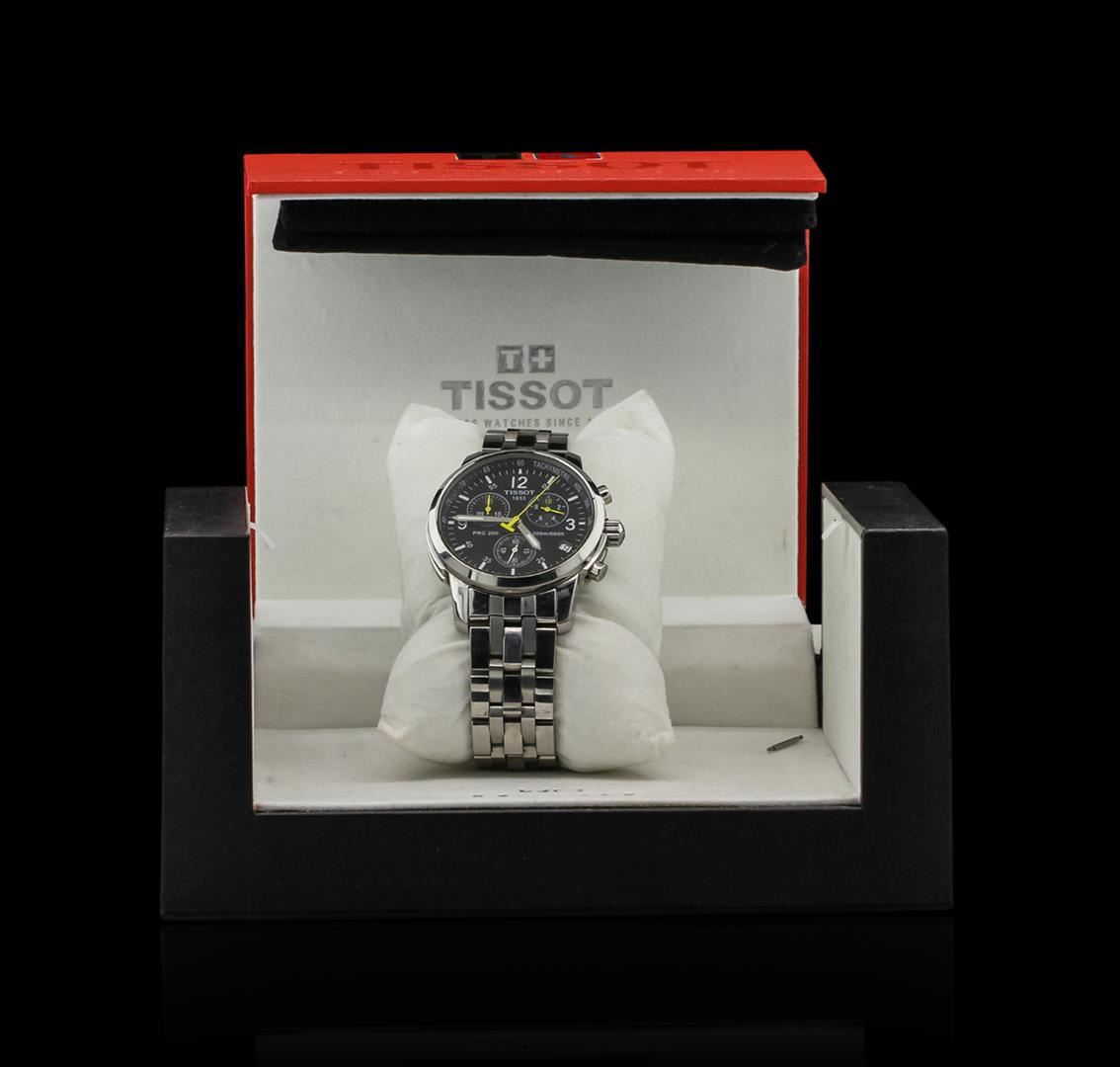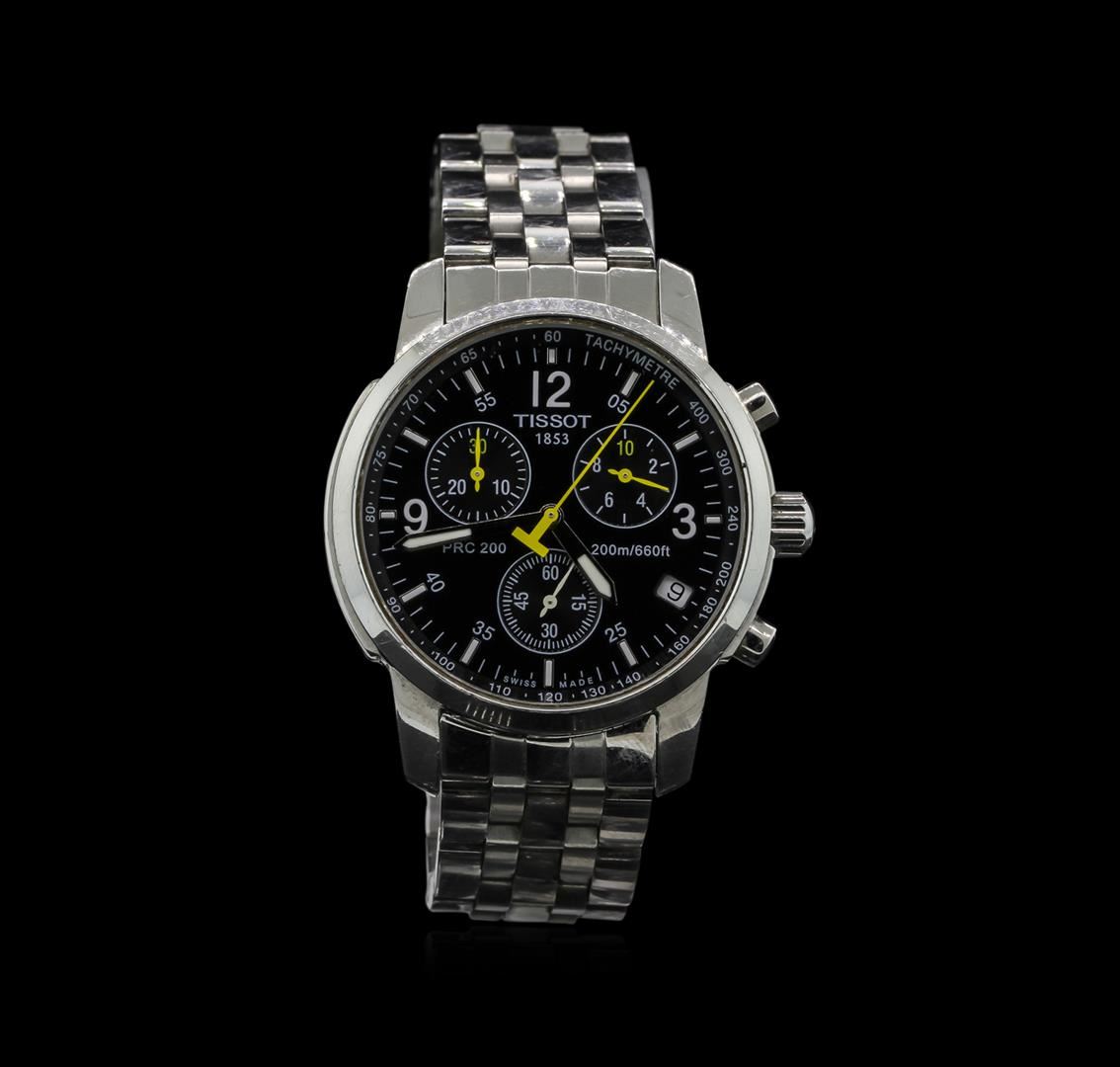 One Tissot 1853 PRC200 Chronograph Men's Wristwatch featuring: Stainless Steel round case and bracelet. Black dial. Luminous hour hands and markers. Yellow second hand. Features tachymetre. White Arabic numerals. Chronograph functions with three sub dials. Analog display. Stationary bezel. Date located at 4 o'clock position. Screw lock crown with Tissot logo. Fold over clasp with push button safety. Water Resistant 200m. Scratch resistant sapphire crystal. Quartz movement. Swiss Made. Total weight of wristwatch: 140.40 grams.