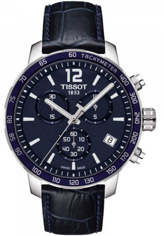 Model: T095.417.16.047.00 - CASE = [Material:Stainless Steel], [Case Diameter:42], [Bezel:Fixed], [Case Back:Solid], [Water Resistant:100 Meters/330 Feet], [Crystal:Scratch Resistant Sapphire], DIAL = [Color:Blue], MOVEMENT = [Type:Quartz Chronograph], [Crown:Screw Down], BAND = [Clasp:Tang], [Type:Blue Leather], (In Stock - Ready to ship.)