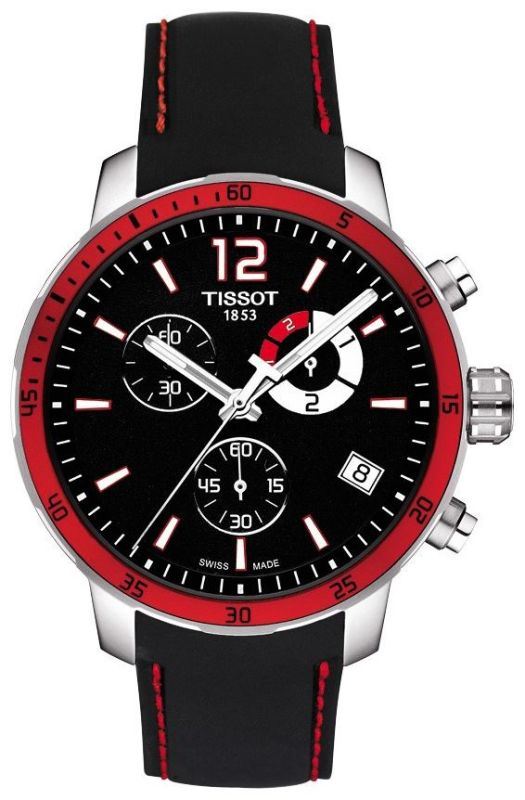 Model: T095.449.17.057.01 - CASE = [Material:Stainless Steel], [Case Diameter:42], [Case Thickness:10.72mm], [Bezel:Fixed], [Case Back:Solid], [Water Resistant:100 Meters - 330 Feet], [Crystal:Scratch Resistant Sapphire], DIAL = [Color:Black], MOVEMENT = [Type:Quartz], BAND = [Clasp:Tang], [Type:Black Rubber with Red Stitching], (In Stock - Ready to ship.)