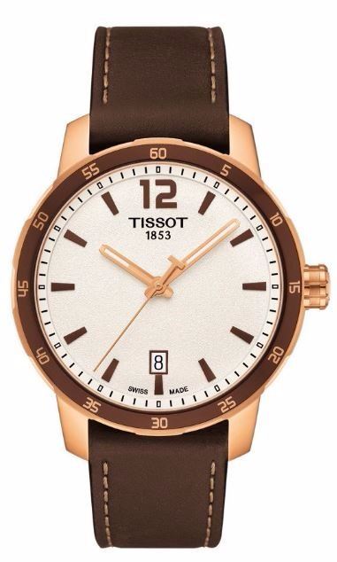 Model: T095.410.36.037.00 - CASE = [Material:Stainless Steel with Rose Gold PVD Coating], [Case Diameter:40], [Case Thickness:9.12mm], [Bezel:Fixed], [Case Back:Solid], [Water Resistant:100 Meters - 330 Feet], [Crystal:Scratch Resistant Sapphire],; DIAL = [Color:Silver],; MOVEMENT = [Type:Quartz], [Crown:Push In],; BAND = [Clasp:Tang], [Type:Brown Leather], (Usually ships in 1 to 2 weeks.)