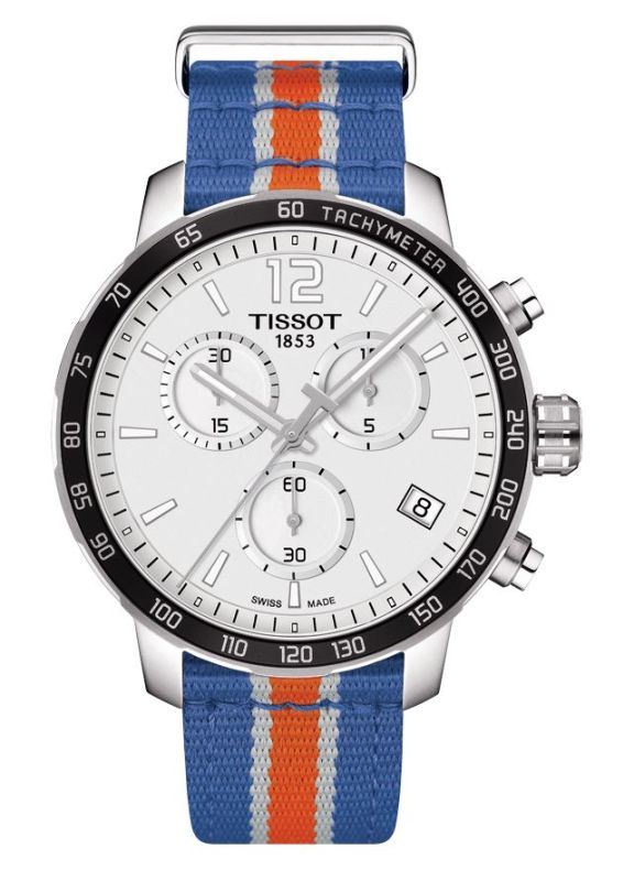 Model: T095.417.17.037.06 - CASE = [Material:Stainless Steel], [Case Diameter:42], [Case Thickness:11.52mm], [Case Back:Solid], [Water Resistant:100 Meters - 330 Feet], [Crystal:Scratch Resistant Sapphire], DIAL = [Color:Silver with Arabic and Index Numerals], MOVEMENT = [Type:Quartz], BAND = [Clasp:Tang], [Type:Blue and Orange Fabric], (In Stock - Ready to ship.)