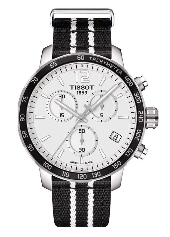 Model: T095.417.17.037.07 - CASE = [Material:Stainless Steel], [Case Diameter:42], [Case Thickness:11.52mm], [Case Back:Solid], [Water Resistant:100 Meters - 330 Feet], [Crystal:Scratch Resistant Sapphire],; DIAL = [Color:Silver with Arabic and Index Numerals],; MOVEMENT = [Type:Quartz],; BAND = [Clasp:Tang], [Type:Black and White Fabric], (Usually ships in 2 to 4 weeks.)