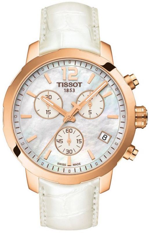 Model: T095.417.36.117.00 - CASE = [Material:Stainless Steel], [Case Diameter:42], [Case Thickness:10.72mm], [Water Resistant:100 Meters - 330 Feet], [Crystal:Scratch Resistant Sapphire], DIAL = [Color:White Mother of Pearl with Arabic + Index Numerals], MOVEMENT = [Type:Quartz], BAND = [Clasp:Tang], [Type:White Leather], (Usually ships in 1 to 2 weeks.)