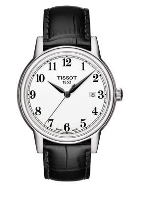 Model: T085.410.16.012.00 - CASE = [Material:Stainless Steel], [Case Diameter:40], [Case Thickness:8.35mm], [Bezel:Fixed], [Case Back:Solid], [Water Resistant:30 Meters - 100 Feet], [Crystal:Scratch Resistant Sapphire], DIAL = [Color:White Arabic], MOVEMENT = [Type:Quartz], [Crown:Push In], BAND = [Clasp:Tang], [Type:Black Leather], (In Stock - Ready to ship.)