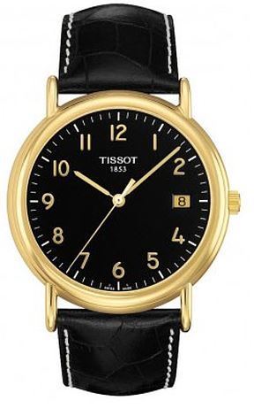 Model: T907.410.16.052.00 - CASE = [Material:18kt Gold], [Case Diameter:40], [Case Thickness:6.55mm], [Water Resistant:30 Meters - 100 Feet], [Crystal:Scratch Resistant Sapphire], DIAL = [Color:Black Arabic], MOVEMENT = [Type:Quartz], BAND = [Clasp:Tang], [Type:Black Leather], (Usually ships in 1 to 2 weeks.)