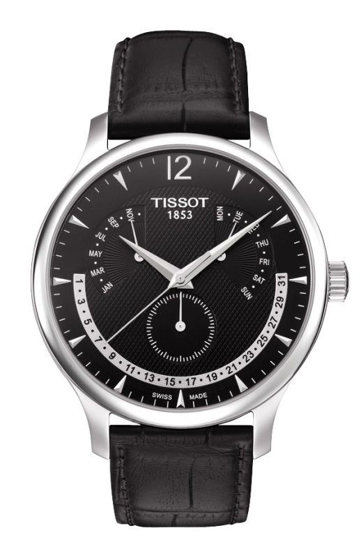 Model: T063.637.16.057.00 - CASE = [Material:Stainless Steel], [Case Diameter:42], [Case Thickness:7.47mm], [Case Back:Solid], [Water Resistant:30 Meters/100 Feet], [Crystal:Scratch Resistant Sapphire Crystal], DIAL = [Color:Black], MOVEMENT = [Type:Battery Powered Quartz], BAND = [Clasp:Double Folding Deployment], [Type:Black Crocodile Leather], (In Stock - Ready to ship.)