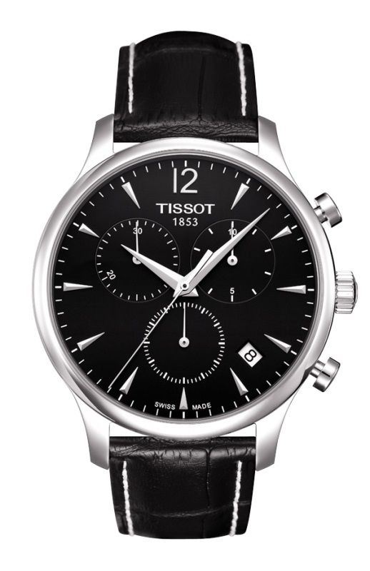 Model: T063.617.16.057.00 - CASE = [Material:Stainless Steel], [Case Diameter:42], [Case Thickness:11.07mm], [Case Back:Solid], [Water Resistant:30 Meters/100 Feet], [Crystal:Scratch Resistant Sapphire Crystal], DIAL = [Color:Black], MOVEMENT = [Type:Battery Powered Quartz], BAND = [Clasp:Double Folding Deployment], [Type:Black Leather with White Stitching], (In Stock - Ready to ship.)