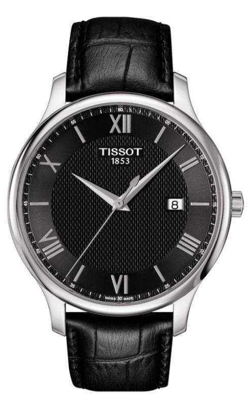 Model: T063.610.16.058.00 - CASE = [Material:Stainless Steel], [Case Diameter:42], [Case Thickness:7.47mm], [Bezel:Fixed], [Case Back:Solid], [Water Resistant:30 Meters - 100 Feet], [Crystal:Scratch Resistant Sapphire], DIAL = [Color:Black with Roman Numerals], MOVEMENT = [Type:Quartz], [Crown:Push In], BAND = [Clasp:Deployment], [Type:Black Leather], (Usually ships in 1 to 2 weeks.)
