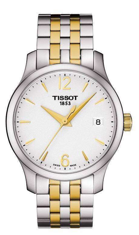 Model: T063.210.22.037.00 - CASE = [Material:Stainless Steel], [Case Diameter:33], [Case Thickness:7.3mm], [Bezel:Fixed], [Case Back:Solid], [Water Resistant:30 Meters - 100 Feet], [Crystal:Scratch Resistant Sapphire], DIAL = [Color:Silver with Arabic + Index Numerals], MOVEMENT = [Type:Quartz], BAND = [Clasp:Deployment], [Type:Two Tone Stainless Steel], (Usually ships in 1 to 2 business days.)