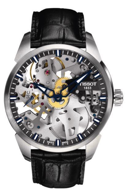 Model: T070.405.16.411.00 - CASE = [Material:Stainless Steel], [Case Diameter:43], [Case Thickness:11.99mm], [Bezel:Fixed], [Case Back:Skeleton], [Water Resistant:50 Meters - 165 Feet], [Crystal:Scratch Resistant Sapphire], DIAL = [Color:Skeleton], MOVEMENT = [Type:Automatic], [Crown:Push In], BAND = [Clasp:Tang], [Type:Black Leather], (Usually ships in 1 to 2 weeks.)
