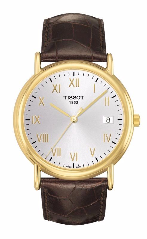 Model: T907.410.16.033.00 - CASE = [Material:18k Yellow Gold], [Case Diameter:40], [Case Thickness:6.55mm], [Case Back:Solid], [Water Resistant:30 Meters/100 Feet], [Crystal:Scratch Resistant Sapphire Crystal],; DIAL = [Color:Silver with Roman Numerals],; MOVEMENT = [Type:Battery Powered Quartz],; BAND = [Clasp:Tang], [Type:Brown Leather], (Usually ships in 1 to 2 weeks.)