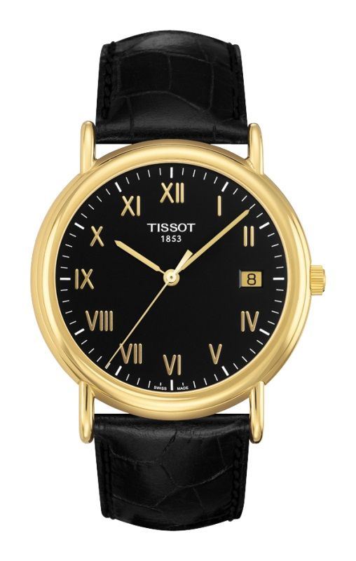 Model: T907.410.16.053.00 - CASE = [Material:18k Yellow Gold], [Case Diameter:40], [Case Thickness:6.55mm], [Case Back:Solid], [Water Resistant:30 Meters/100 Feet], [Crystal:Scratch Resistant Sapphire Crystal], DIAL = [Color:Black with Roman Numerals], MOVEMENT = [Type:Battery Powered Quartz], BAND = [Clasp:Tang], [Type:Black Leather], (Usually ships in 1 to 2 weeks.)