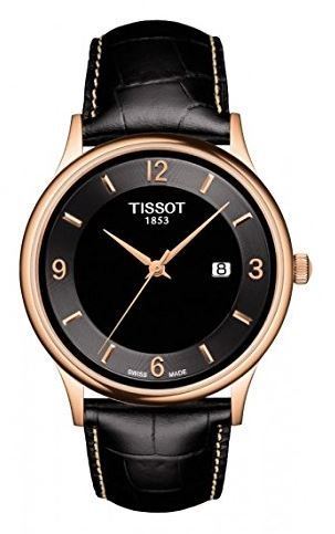Model: T914.410.76.057.00 - CASE = [Material:18kt Rose Gold], [Case Diameter:40], [Case Thickness:5.65mm], [Water Resistant:30 Meters - 100 Feet], [Crystal:Scratch Resistant Sapphire], DIAL = [Color:Black Arabic Index], MOVEMENT = [Type:Quartz], BAND = [Clasp:Deployment], [Type:Black Leather], (Usually ships in 1 to 2 weeks.)
