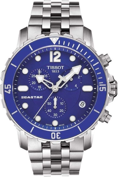 Model: T066.417.11.047.00 - CASE = [Material:Stainless Steel], [Case Diameter:45], [Case Thickness:13.3mm], [Bezel:Uni-Directional Rotation], [Case Back:Solid], [Water Resistant:300 Meters - 1000 Feet], [Crystal:Scratch Resistant Sapphire], DIAL = [Color:Blue with Arabic + Index Numerals], MOVEMENT = [Type:Quartz Chronograph], [Crown:Screw Down], BAND = [Clasp:Folding], [Type:Stainless Steel], (Usually ships in 1 to 2 business days.)