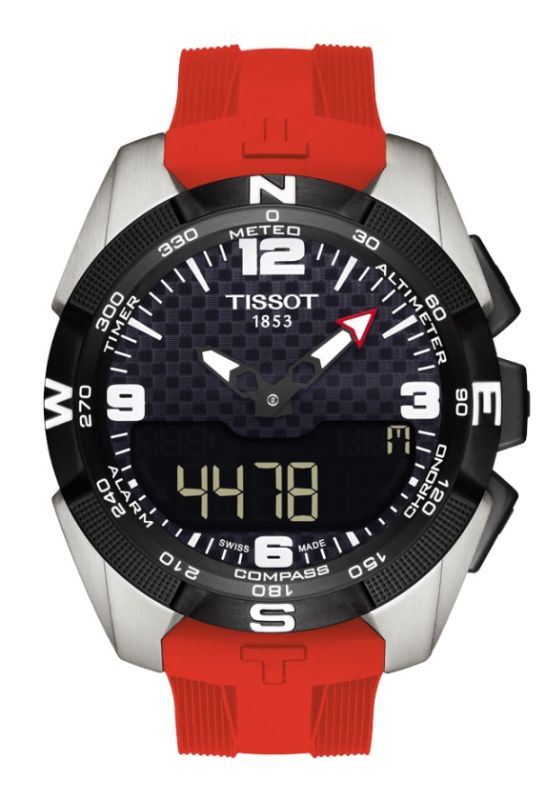 Model: T091.420.47.057.00 - CASE = [Material:Titanium], [Case Diameter:45], [Case Thickness:13mm], [Bezel:Fixed], [Case Back:Solid], [Water Resistant:100 Meters - 330 Feet], [Crystal:Scratch Resistant Sapphire], DIAL = [Color:Black], MOVEMENT = [Type:Quartz], [Crown:Push In], BAND = [Clasp:Folding], [Type:Red Rubber], (Usually ships in 1 to 2 weeks.)