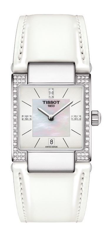 Model: T090.310.66.116.00 - CASE = [Material:Stainless Steel], [Case Diameter:23], [Case Thickness:7.33mm], [Bezel:Fixed], [Case Back:Solid], [Water Resistant:50 Meters - 165 Feet], [Crystal:Scratch Resistant Sapphire], DIAL = [Color:Mother of Pearl Index and Diamonds], MOVEMENT = [Type:Quartz], BAND = [Clasp:Tang], [Type:White Leather], (Usually ships in 1 to 2 weeks.)