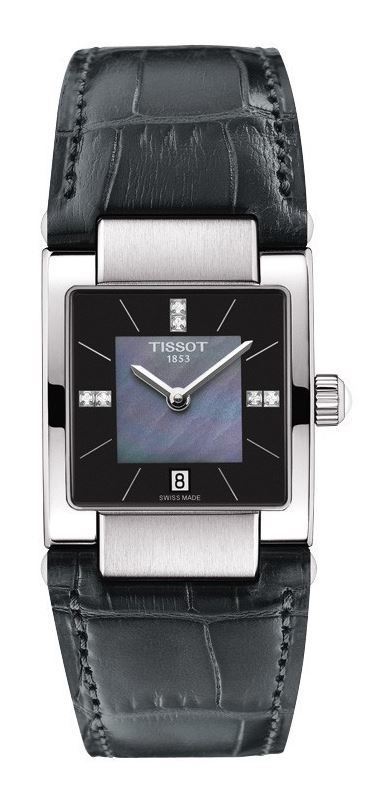 Model: T090.310.16.126.00 - CASE = [Material:Stainless Steel], [Case Diameter:23], [Case Thickness:7.33mm], [Water Resistant:50 Meters - 165 Feet], [Crystal:Scratch Resistant Sapphire], DIAL = [Color:Black Mother of Pearls Index and Diamonds], MOVEMENT = [Type:Quartz], BAND = [Clasp:Tang], [Type:Black Leather], (Usually ships in 1 to 2 weeks.)