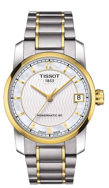 Model: T087.207.55.117.00 - CASE = [Material:Titanium], [Case Diameter:32], [Case Thickness:18mm], [Bezel:Fixed], [Case Back:Solid], [Water Resistant:50 Meters - 165 Feet], [Crystal:Scratch Resistant Sapphire], DIAL = [Color:Mother of Pearl with Arabic + Index Numerals], MOVEMENT = [Type:Automatic], [Crown:Push In], BAND = [Clasp:Deployment], [Type:Titanium], (Usually ships in 1 to 2 weeks.)