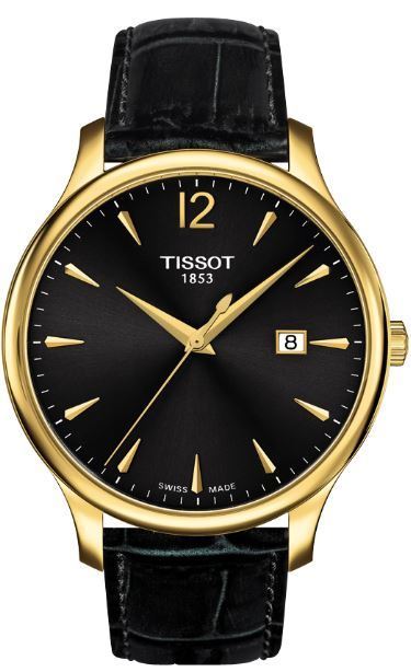 Model: T063.610.36.057.00 - Case,; MATERIALSTAINLESS STEEL WITH YELLOW GOLD PVD COATING = [Case Diameter42], [Case Thickness7.47mm], [BezelFixed], [Case BackSolid], [Water Resistant30 Meters - 100 Feet], [CrystalScratch Resistant Sapphire], Dial,; COLORBLACK = Movement,; TYPEQUARTZ = [CrownPush In], Band,; CLASPDEPLOYMENT = [TypeBlack Leather], (Usually ships in 1 to 2 weeks.)