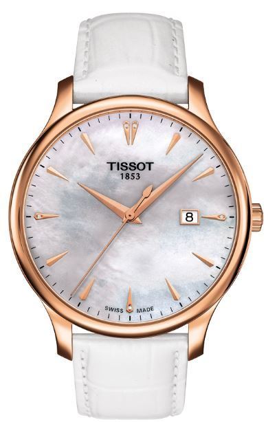 Model: T063.610.36.116.01 - CASE = [Material:Stainless Steel with Rose Gold PVD Coating], [Case Diameter:42], [Case Thickness:7.47mm], [Bezel:Fixed], [Case Back:Solid], [Water Resistant:30 Meters - 100 Feet], [Crystal:Scratch Resistant Sapphire], DIAL = [Color:Mother of Pearl], MOVEMENT = [Type:Quartz], [Crown:Push In], BAND = [Clasp:Deployment], [Type:White Leather], (Usually ships in 1 to 2 weeks.)