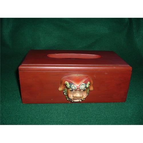 Wooden tissue paper box with antique pieces of carving on both sides and in the front. This box is in antique Chinese red. It can be mounted on the wall. 11"L x 4 1/2"H x 5 1/2"D.