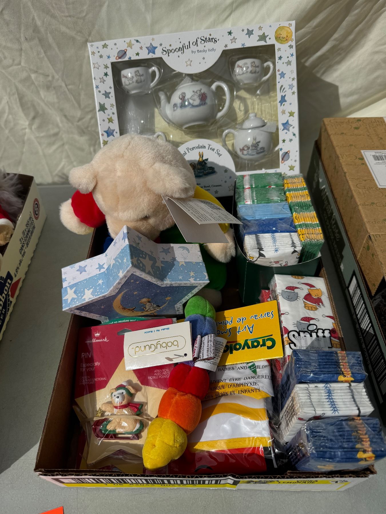 Tissues, mini porcelain tea set and other items