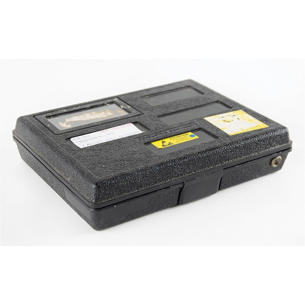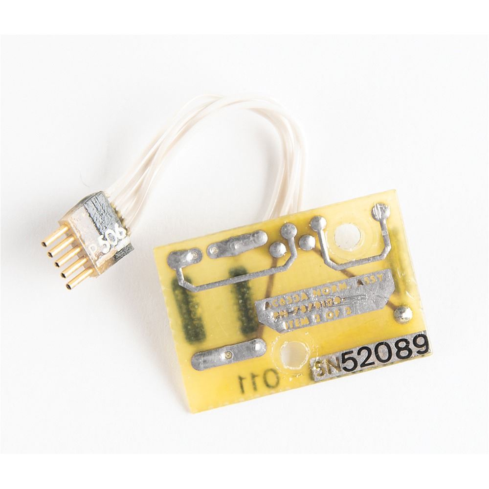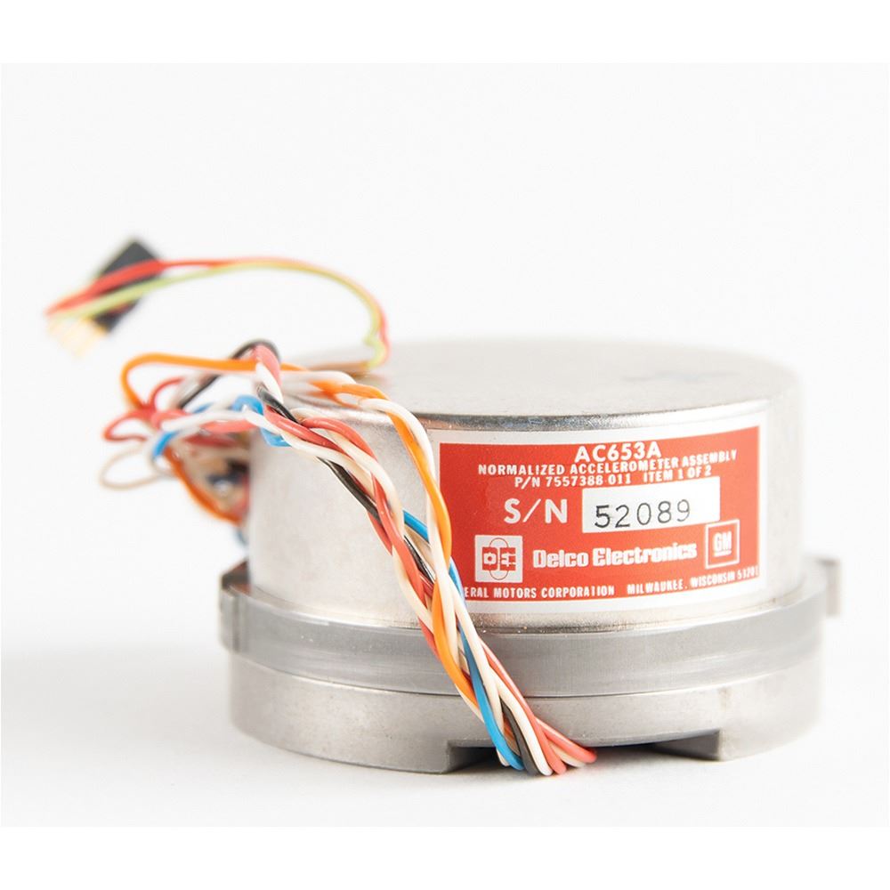 Titan II SLV accelerometer assembly, measuring approximately 1.75è in diameter and 1è tall with short wiring cables attached, with a Delco Electronics label on the side: "AC653A, Normalized Accelerometer Assembly, P/N 7557388-011 Item 1 of 2, S/N 52089." It includes a matching small circuit board, also marked "52089," with a cable and connector, used to standardize the outputs or bias of the accelerometer. Includes an inspection tag (with correct serial, but part no. curiously one digit off), identifying the part as being associated with the "Titan II SLV" program, and that it was removed from "IMU S/N 65." Includes its plastic case. The first Titan II guidance system was built by ACDelco using a gyroscope-based IMU (Inertial Measurement Unit) derived from original designs from MIT's Draper Labs‰ÛÓsimilar to the IMUs used on the Apollo spacecraft.