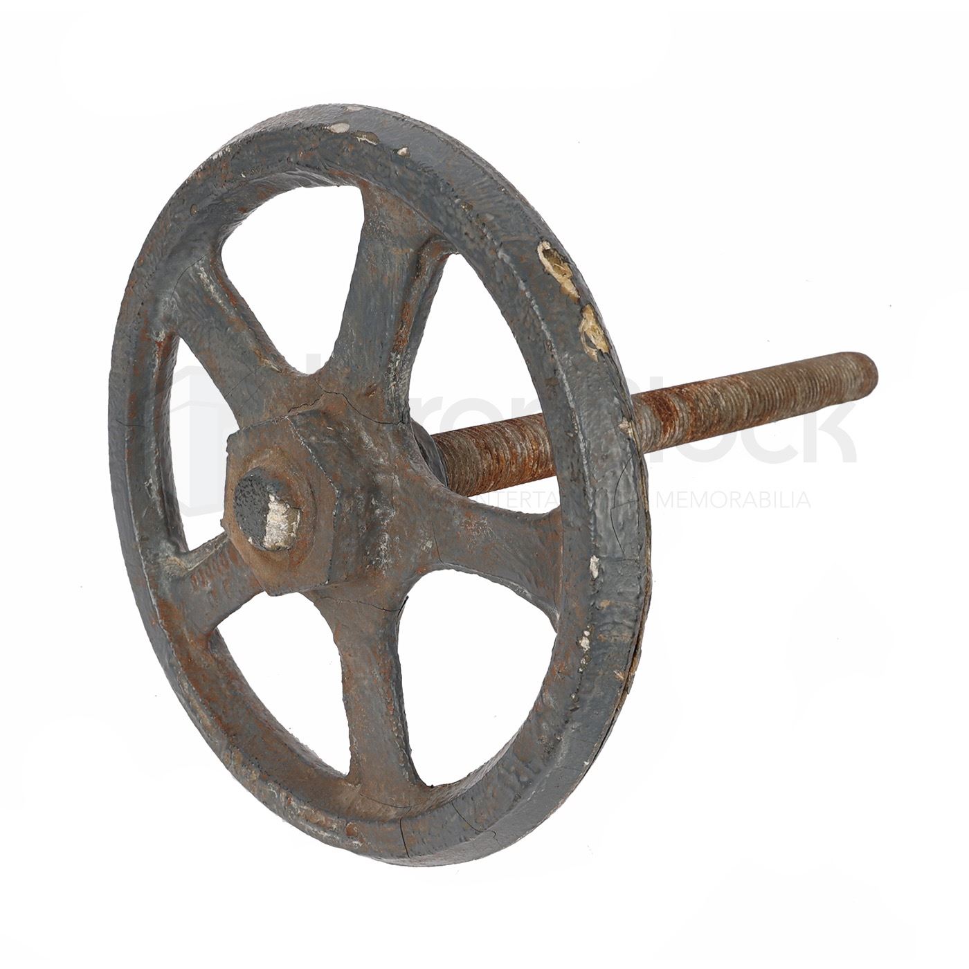 Steam Room Release Wheel used in the production of the 1997 James Cameron classic Titanic. James Cameron's "Titanic" is an epic, action-packed romance set against the ill-fated maiden voyage of the R.M.S. Titanic; the pride and joy of the White Star Line and, at the time, the largest moving object ever built. She was the most luxurious liner of her era -- the "ship of dreams" -- which ultimately carried over 1,500 people to their death in the ice cold waters of the North Atlantic in the early hours of April 15, 1912. This piece can be seen in the full steam room set featured in the film and is constructed of fiberglass and resin, with the wheel section painted gray, and the threaded rod white in color. This piece shows slight wear from use on set but still remains in excelled production used condition.
