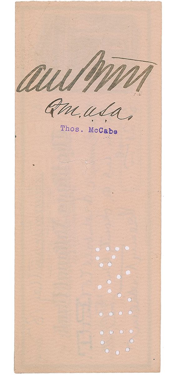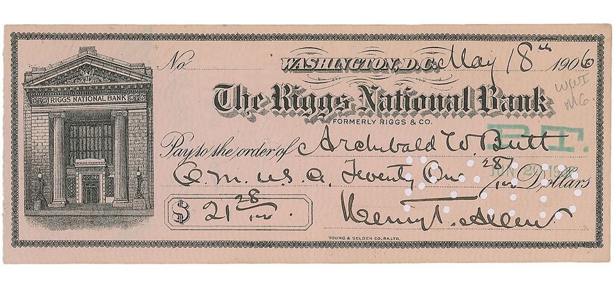 American military officer (born 1865) who served as an influential aide to Presidents Roosevelt and Taft before perishing during the sinking of the Titanic in 1912. Bank check, 7.5 x 3, filled out in another hand and made payable to Archibald W. Butt for $21.28, May 18, 1906, endorsed on the reverse by Butt, “A. W. Butt.” In fine condition, with expected cancellation cuts and holes.