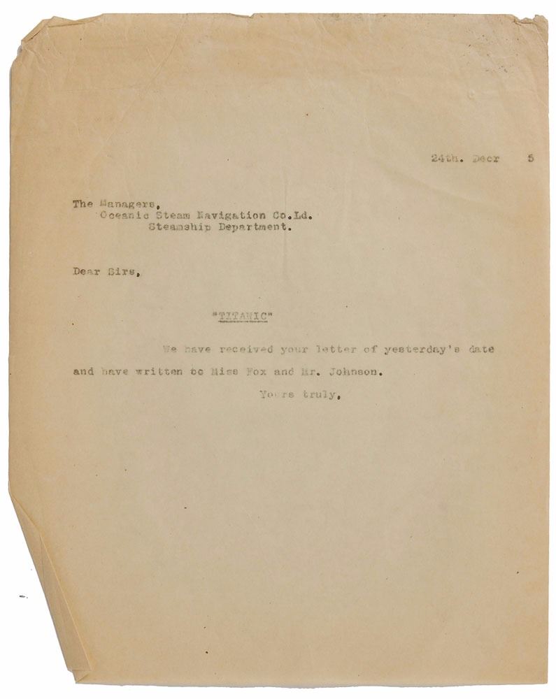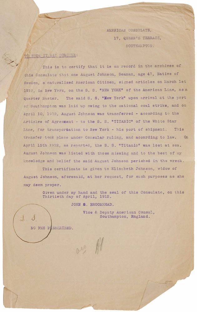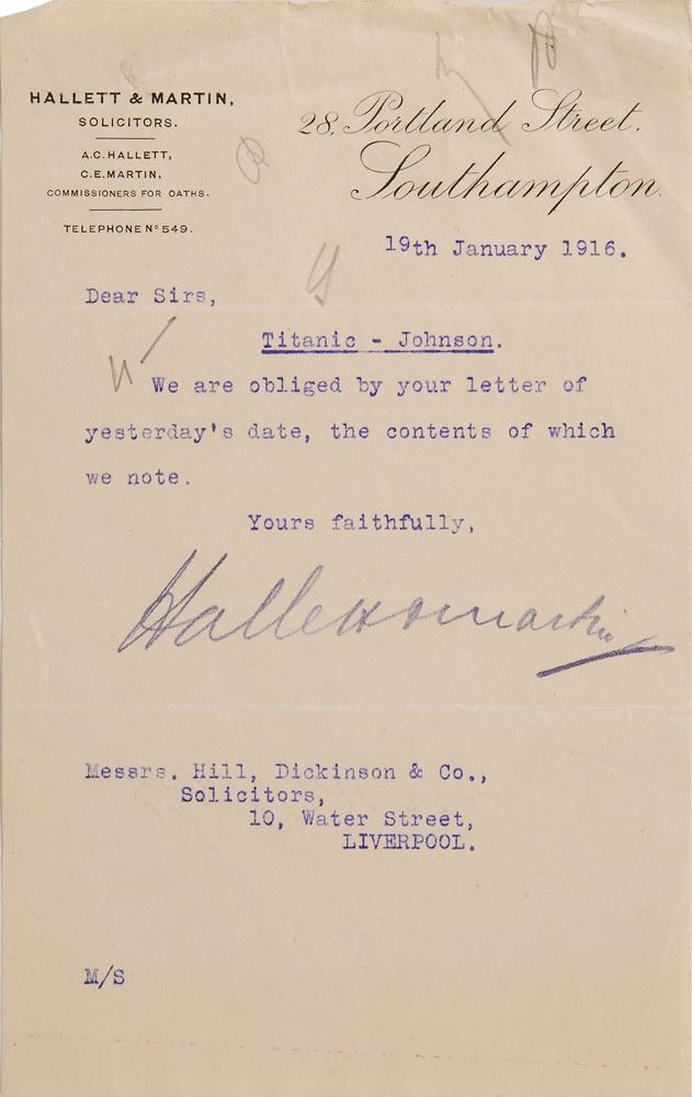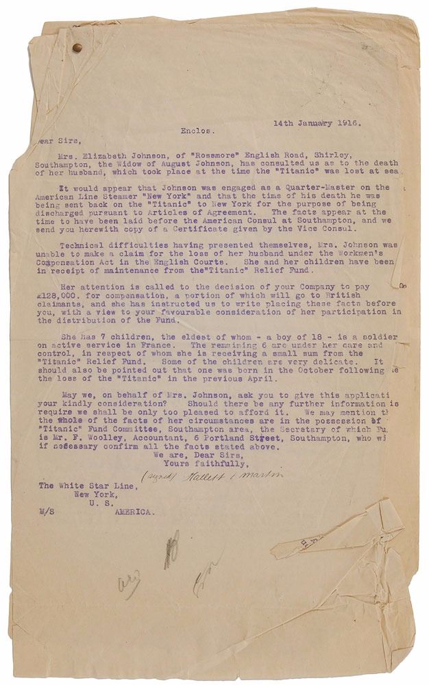 Collection of four letters related to an insurance claim by the widow of Titanic disaster victim August Johnson, consisting of a letter from her lawyers Hallett & Martin to the White Star Line, a letter from Hallett & Martin to the White Star Line's law firm, a letter from the American consulate in Southampton, and a retained carbon concerning the response to the inquiry. The primary document is the letter from Johnson's law firm to the White Star Line, in part: "Mrs. Elizabeth Johnson…Widow of August Johnson, has consulted us as to the death of her husband, which took place at the time the 'Titanic' was lost at sea. It would appear that Johnson was engaged as a Quarter-Master on the American Line Steamer 'New York' and at the time of his death was being sent back on the 'Titanic' to New York for the purpose of being discharged…Mrs. Johnson was unable to make a claim for the loss of her husband under the Workmen's Compensation Act in the English Courts. She and her children have been in receipt of maintenance from the 'Titanic' Relief Fund. Her attention is called to the decision of your Company to pay £128,000 for compensation, a portion of which will go to British claimants…She has 7 children, the eldest of whom—a boy of 18—is a soldier on active service in France…Some of the children are very delicate. It should also be pointed out thta one was born in the October following the loss of the 'Titanic' in the previous April…May we, on behalf of Mrs. Johnson, ask you to give this application your kindly consideration?" Attached is the letter from the American consulate at Southampton, certifying the accuracy of the facts stated. The other letters are short and are to confirm receipt. In overall very good condition, with scattered tears and creasing.