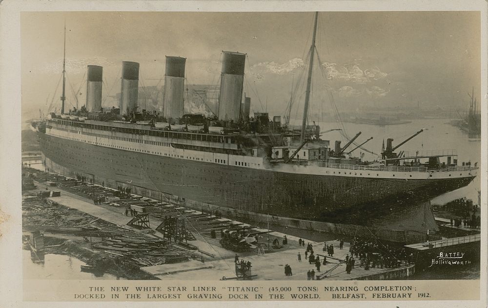Unused real photo postcard of a composite photograph and artist’s rendition of the Titanic dry docked at the Belfast shipyard where it was designed and built by Harland and Wolff, captioned at the bottom: “The new White Star Liner ‘Titanic’ (45,000 tons) nearing completion; docked in the largest graving dock in the world. Belfast, February 1912.” In fine condition, with trivial soiling to the left border, a mild circular ripple to the emulsion on the left side, and an erased pencil notation to the reverse.